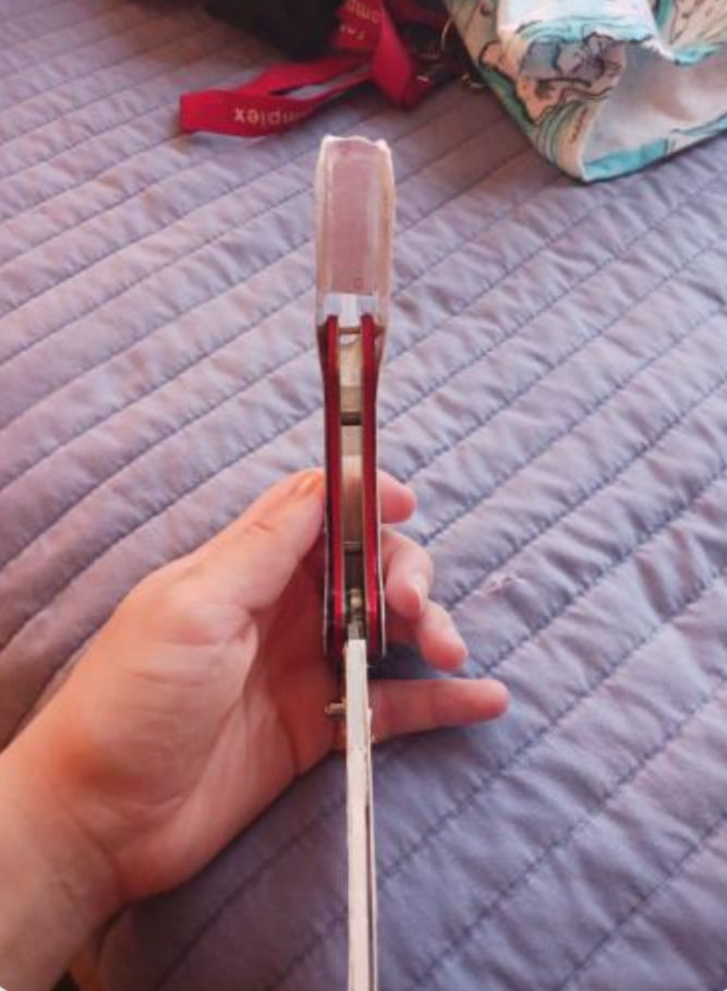 The razor was made with Mackenzie Crossland. We used an old pocket knife for the base and built up the shape with foam core and thin carboard. in order to make it usable in the right or left hand, a pocket in the handle was made for the pipette to sit in. A tube was imbedded into the blade and ran to the tip. It was finally painted with metallic paints and sealed with varnish.
